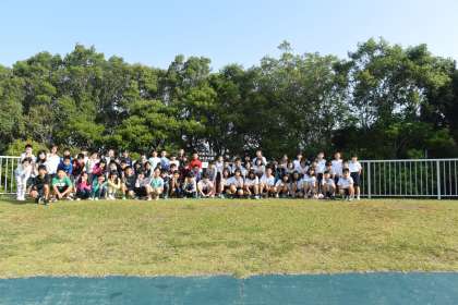 なかよしタイム,キャンプファイヤーなど一緒に活動してきた紫野小の人と記念にパチリ!!朝日が少しまぶしいです。