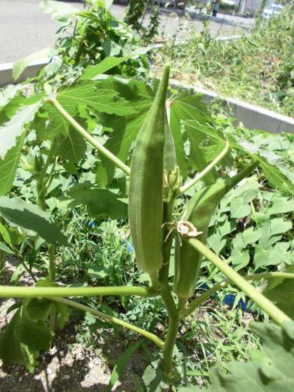 今日から夏休みです。猛暑の中,理科の学習で種をまいた植物たちが,花や実をつけてきています。学習会やプールで学校に来たときには,また,見てください。