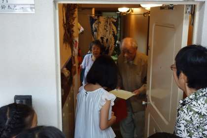 地域に住まわれる88歳を迎えられた方々の,米寿のお祝いをしました。以前から準備してきたお祝いの色紙を持って,グループに分かれて民生委員の方々と一緒に届けに行きました。地域の大先輩の方々にはとても喜んでもらえ,子どもたちも嬉しそうでした。これからもいつまでもお元気で,地域を見守っていただきたいです。