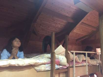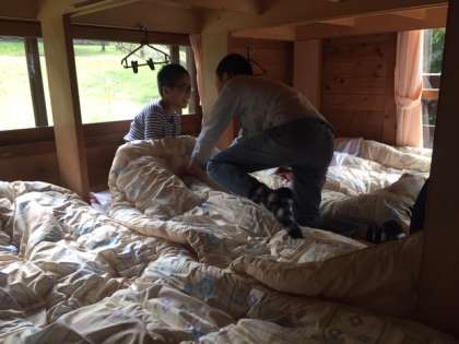 今夜から泊まるロッジに入り,寝具準備を始めました。二人一組でてきぱきと協力しながら作業を進めています。