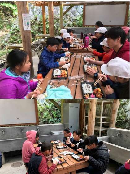 魚の塩焼きととお弁当のごうかなお昼ご飯をいただいています。自分たちでさばいた魚は格別です!
