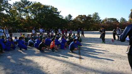 大文字駅伝支部予選会開会式が始まりました。これから,1年間頑張って練習してきた成果を見せてくれることと思います。学校からは,6年生と5年生の希望者と先生方,保護者の皆さんが応援に駆けつけてくれています。みんなの声援をうけてがんばれ!乾隆小!!