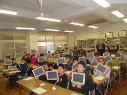 社会見学で「学校歴史博物館」と「京大博物館」に行きました。午前は学校歴史博物館で,戦前から現在までに学校がどのように変遷してきたのかや,使われてきた教具,給食の移り変わりなどを見学して来ました。その後,ノートや鉛筆が普及していなかった時代に使われていた「石筆」と「石盤」を使って,字を書いてみました。細かい字が書きにくかったり,たくさん書けないことを感じたのではないでしょうか。