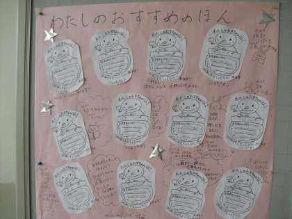 図書委員会の取組で,図書室に本を借りにきた友だちに手作りのしおりをプレゼントしてくれています。いつもよりもたくさんの人が本を借りに来ています。また,おすすめの本を紹介する掲示も用意してくれています。次は,どの本を借りようかなあ・・・