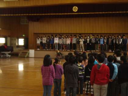 全校児童で今月の歌「世界が一つになるまで」を合唱しました。その後は,