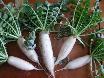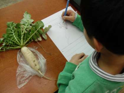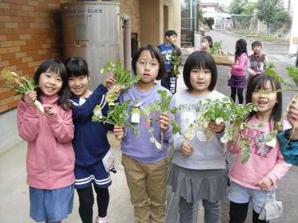 大根を抜いてみると,「抜けた」「やったー。」と喜んでいる子どもたち。大小、大きさは色々でしたが,子どもたちは収穫できた喜びと,「早く食べたいな。」という気持ちでいっぱいでした。