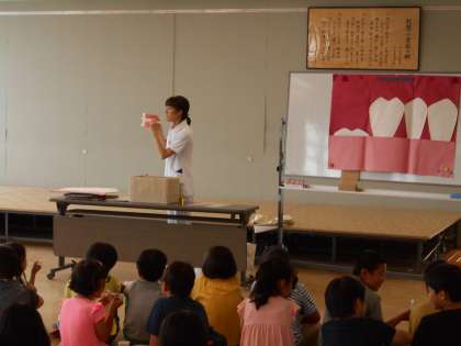 歯科衛生士さんからふだん身近に飲んでいる飲みものには,たくさんの量の砂糖が入っていることや歯磨きをしないでおくとすぐ虫歯が増えることを教えてもらいました。そのあと,正しい歯の磨き方を教えてもらいました。みんなしっかりと話を聞き,正しい歯の磨き方の練習にチャレンジしていました。おうちでも毎日しっかりと歯を磨いてほしいですね。