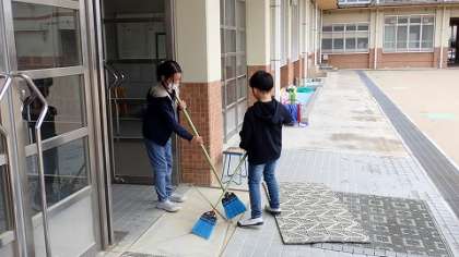 中学年の子どもたちが,昇降口のそうじをしてくれました。昇降口に上がった運動場の砂をきれいに掃き集めたり,排水溝の砂を取り除いたり,一生懸命にがんばってくれました。