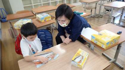 静かに課題に取り組んでいます。1年生の子どもたちは,はじめて自分の名前を書くことに挑戦しています。一画一画,形をよく見てていねいに書いていました。
