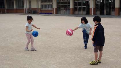 「♪あんたがた どこさ〜」と歌いながら,ボールをついていました。上手に足を抜く姿が見られました。