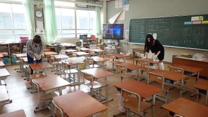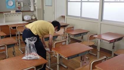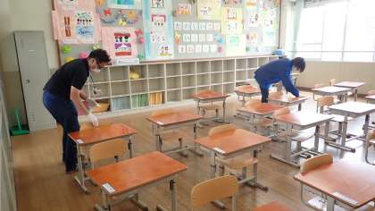 明日の教育相談日に向けて,学校の消毒を行いました。子どもたちの使う机やいす,ドアなどの消毒をしています。