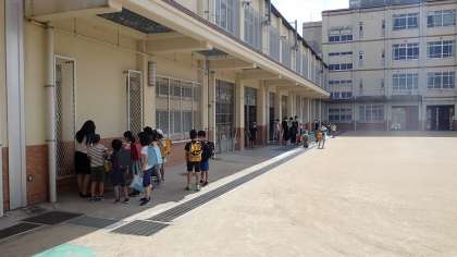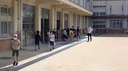 今日のオリエンテーションは,学年ごとの分散登校です。1・3・4年生とコスモス学級の子どもたちが元気に登校してきました。
