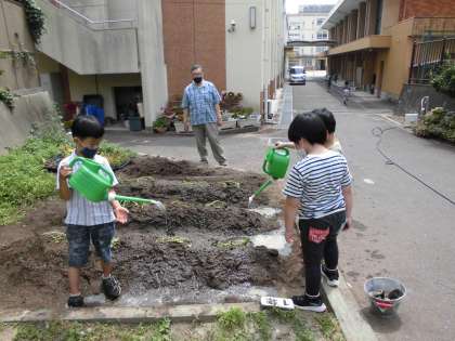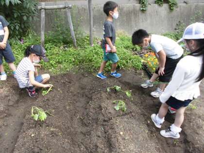 1年生の学校園にさつまいもの苗を植えました。