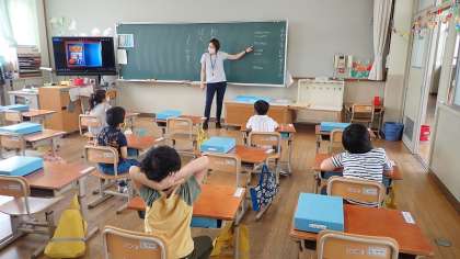 1年生は,先生のモデルを見ながら,自己紹介の仕方を確かめていました。