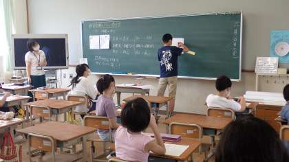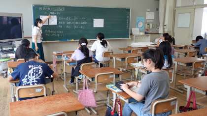 6年生は算数「対称な図形」の学習をしています。「点対称」な図形の特徴や中心の見つけ方を考えたり,発表したりしていました。