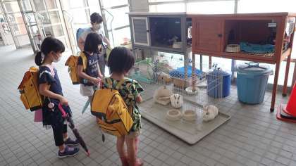 下校前に,子どもたちがうさぎの様子を見ていました。