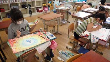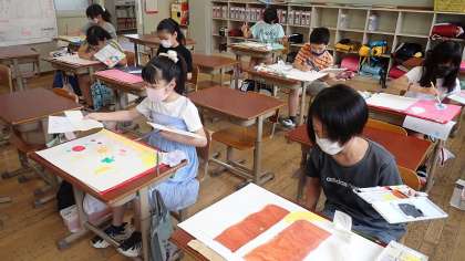 5年生は図工「心のもよう」の学習に取り組んでいます。いろいろな感情を模様で表すとどうなるでしょう。表し方を工夫して筆を走らせていました。