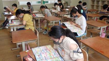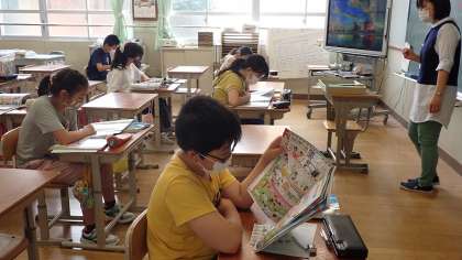資料集に載っている「人生ゲーム」のすごろくを見ながら,生活する中で選挙や納税などを経験することを確かめています。