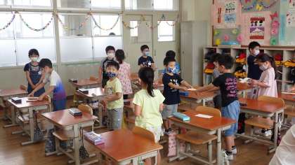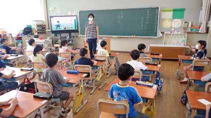1年生は,国語の学習をしています。自分の名前を伝えた後,「どうぞよろしくと」自分の名前を書いたカードを手渡していました。受け取るときには,大事そうに両手で受け取っていました。