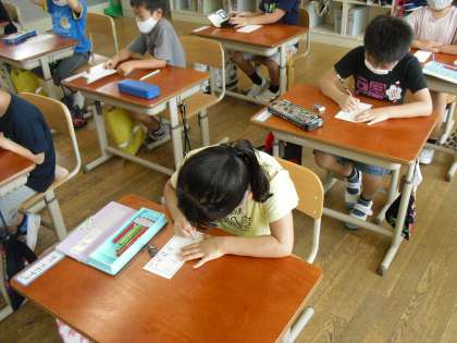 正しい鉛筆の持ち方を確認して,ていねいな文字で自分の名前をカードに書きました。