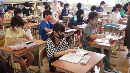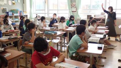 6年生は,外国語の学習をしています。チャンツに合わせてアルファベットを指さす活動に取り組んでいました。出てくるアルファベッツの順番が変わると正しく指さすことができず,みんなで盛り上がりながらアルファベットの読みに慣れ親しむことができました。