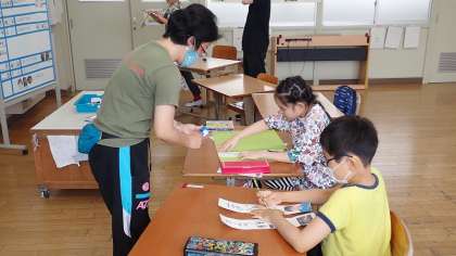 コスモス学級では,係を決めています。鉛筆の下書きを,ていねいになぞっています。5年生は,自分の係だけでなく,2年生の分もカードに書いてあげていました。