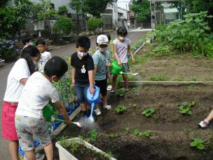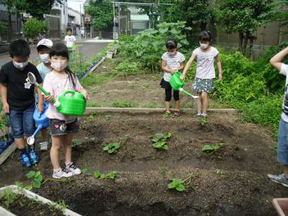 自分の朝顔と,みんなで育てているさつまいもに一生懸命水やりをしています。