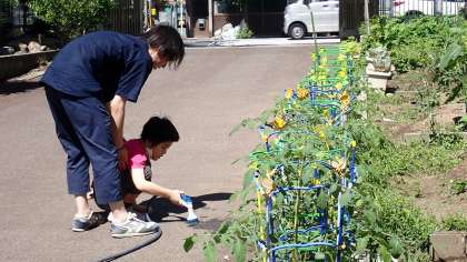コスモス学級では,1日の予定を確認しています。一人一人が,自分の予定表を書き込んでいます。予定を確認した後は,運動場でランニングをして,乾隆ガーデニングの水やりをしました。