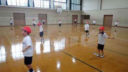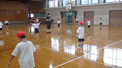 1年生は,2時間目に体育の学習をしていました。密にならないように間隔を広くとって,「なわとび」の前跳びや後ろ跳び,かけ足跳びなどに挑戦しています。引っかからずに,スムーズに跳べる子もいました。