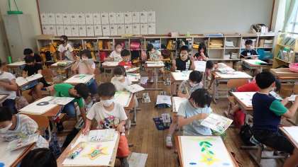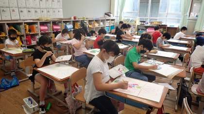 4年生は,図工「まぼろしの花」の学習をしています。下絵をもとに,想像を膨らませて描いています。絵の具の混ぜ方やにじませ方を工夫していました。