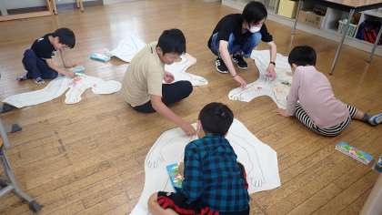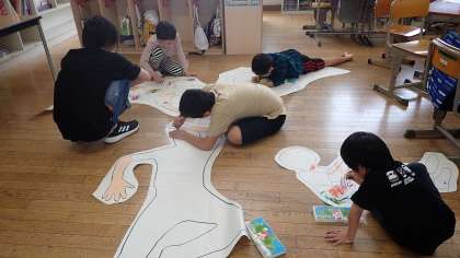 コスモス学級では,「にんげんうつし絵」を描いています。等身大の自分の人型に,クレヨンをつかって色を塗っています。自分の好きな色で塗ったり,自分の好きな絵を描き入れたりして,作品づくりをしています。
