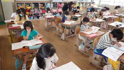 3年生は,算数「わり算」の学習をしています。これまでに学習した内容が身に付いているかどうか,練習問題に取り組んで確かめています。