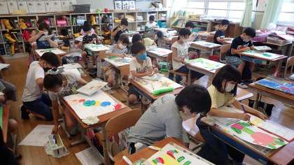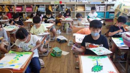 4年生は,図工の学習をしています。「まぼろしの花」の作品もだんだん仕上がってきました。絵の具やコンテなどを使って,背景を描いています。
