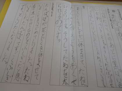 国語では,たんぽぽのちえの学習をしています。この学習では,たんぽぽが生きるためのちえとそのわけを読み取り,それを知って自分の思いをかくということに取り組んでいます。