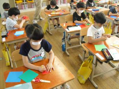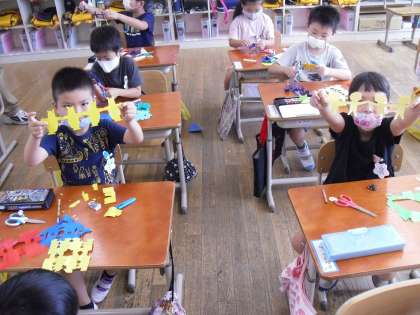 同じ形をつなげるかざりでは,難しくて何回も失敗していましたが,最後にはどうするのかが分かって,みんな,作り上げることができました。失敗は成功のもとですね。