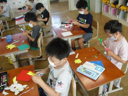 みんなで作り方を見ながらひととおりやってみると,どんどん自分だけのかざりを作ろうとしていました。