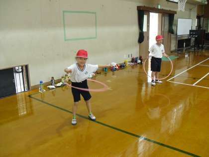 体ほぐしでフラフープをまわしたり跳んだりしてから,ゴムを跳びました。