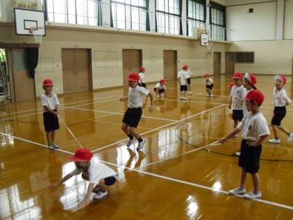 友だちとペアを作ってゴムを持ち,順番を守って楽しくたくさん跳んでいました。