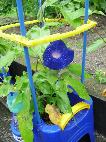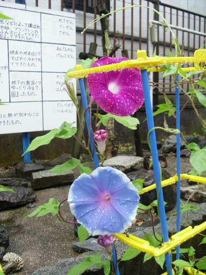 1年生のあさがおが,雨の中も元気に咲いています!