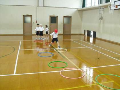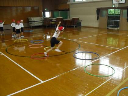 ・遠くに並べられたフープをめがけて思い切り跳ぶ