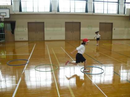 体育科の「とびあそび」では,フラフープを使っていろいろな跳び方をしました。