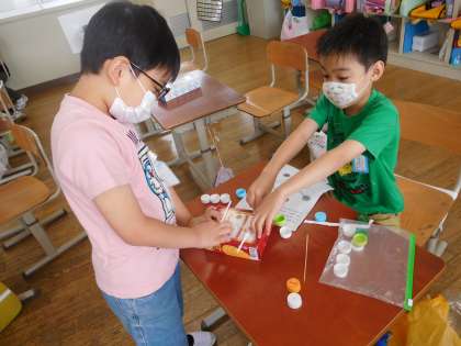 今日の3時間目の生活では,班に分かれて動くおもちゃづくりに挑戦しました。ペットボトルのふたでできたタイヤの車や,風をうけて走る車など,作り方を見ながら声をかけ合って作っていました。来週は1年生を招いておもちゃ大会をします。作りながら,どのおもちゃが楽しんでもらえるかがんばって考えていました。