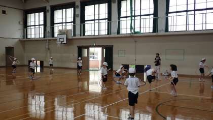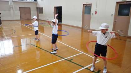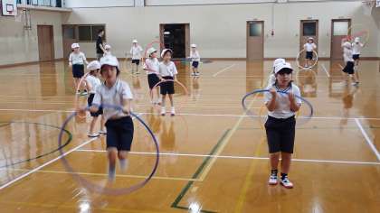 2年生は,体育の「ようぐあそび」の学習をしています。今日は,フープを使って学習しました。フープを回して縄跳びのように跳んだり,腰でフープを回したりしました。長い間ずっと回し続けることができる子もいました。
