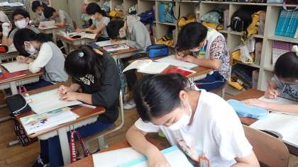 6年生は,国語の「時計の時間と心の時間」の学習をしています。段落相互の関係をとらえて,文章全体の構成を確かめました。1時間の学習のふり返りもていねいに書いていました。