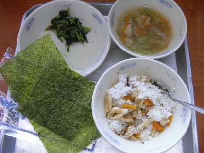 今日の給食は,ごはん・キャベツのすましじる・だいこんばのいためもの・こぎつねちらしの具・手巻きのり・牛乳でした。