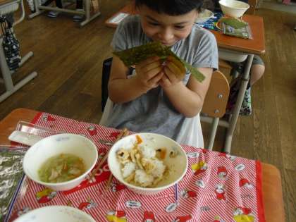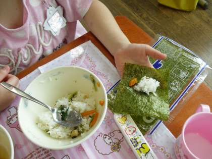 給食で初めて自分で手巻きずしを作りながら食べることを,とても楽しんでいました。楽しく食べると食も進み,キャベツのすまし汁は完食することができました。