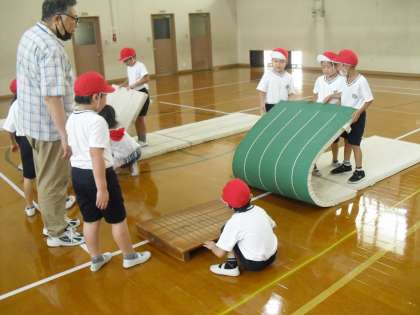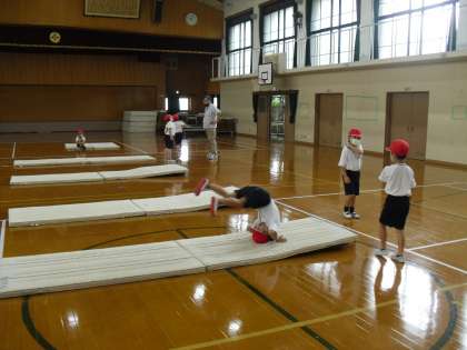 体育科では「マットあそび」をしています。自分の苦手な技にどんどん挑戦しています。
