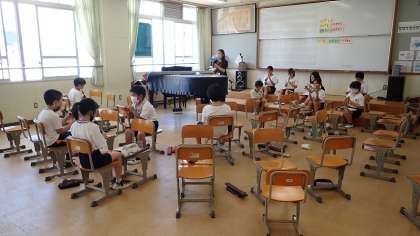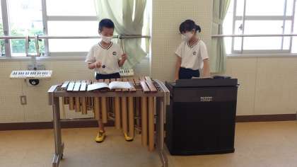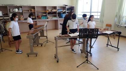 5年生は,音楽の学習で『ラ・バンバ(リボンの踊り)』の合奏に取り組んでいます。音楽室を広く使って密を避けながら,パートごとに練習をしたり,みんなで合奏して音の重なりを確かめたりしています。