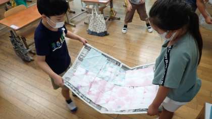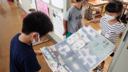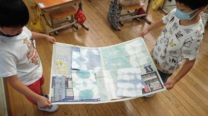 1年生は,生活科の「あさがおであそぼう」の学習に取り組んでいます。今日は,育てたあさがおから色水をつくり,和紙を染める活動に取り組みました。自分だけのすてきな模様ができたようです。