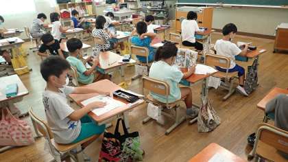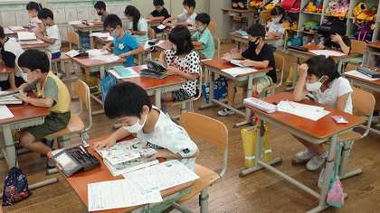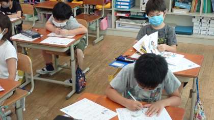 1年生は,ひらがなのプリント学習に取り組んでいます。絵を見て「おもちや」と「おもちゃ」の違いを確かめながら,ていねいに書いていました。プリントが終わったら,読書をしています。静かに読む姿勢が大変立派でした。